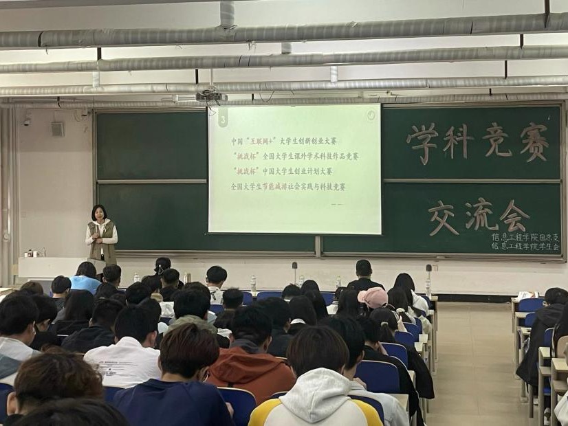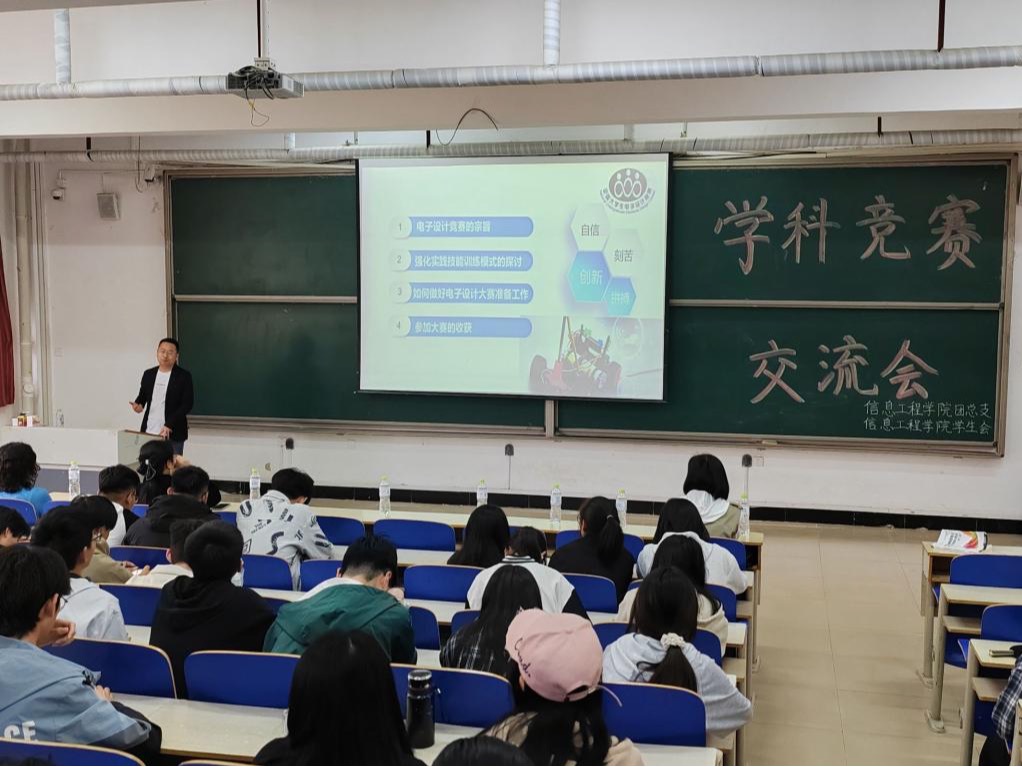 会议伊始,老师们结合自身经验,对“老员工物联网竞赛”、“蓝桥杯”、“计算机四级大赛”、“电子设计竞赛”四个竞赛进行了指导讲解,并从项目的种类、流程、奖金等方面进行了全方位讲解,概述了各竞赛的安排和相关创新创业类竞赛的设置。随后,康凤老师强调了个人能力在竞赛中的基础性作用以及“团队”、“资源”、“想法”三要素的重要性,提醒同学们要注意成员技能、时间节点、前期准备,合理安排时间,打破常规思维模式,加强合作意识,通过参与课外实践和学科竞赛,提高学习兴趣,夯实基础,激发创新能力。最后,各位老师分享了竞赛的趣味经历以及赛场上一个个的成功故事,激励同学们积极参与学科竞赛,抓住机遇,在竞赛中完善自我、超越自我、丰富自我,谱写人生华章。