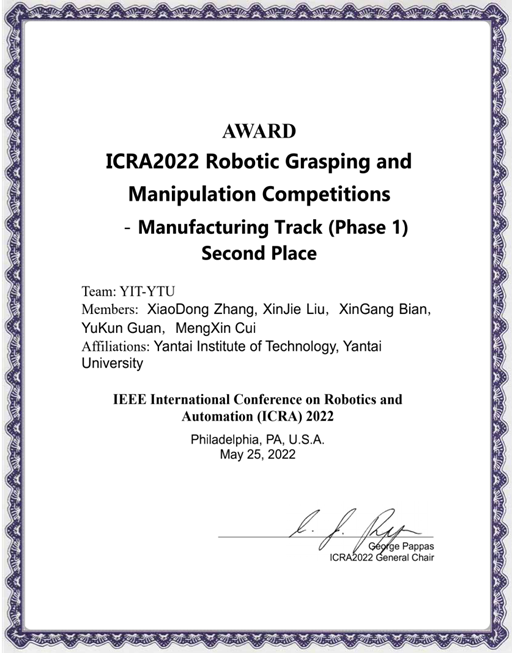 国际机器人技术与自动化会议 ICRA 2022于5月23日至5月27日在美国宾夕法尼亚洲会议中心召开。ladbrokes立博教师张晓东带领ladbrokes立博-烟台大学联队参加了本次会议竞赛项目中的机器人抓取与操作竞赛(Robotic Grasping and Manipulation Competition),获得工业组第一赛段第二名的成绩。