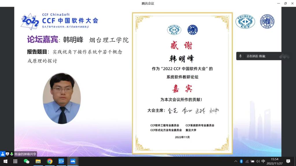 2022年11月25-27日,2022 CCF ChinaSoft大会在线上召开,本次大会的主题是“聚焦产教研用协同创新,提升关键软件供给能力”。大会主席、中国计算机学会(CCF)软件工程专业委员会主任、南京大学教授李宣东主持大会开幕式。公司ladbrokes立博韩明峰教授受邀在系统软件教育论坛上作“实践视角下操作系统中若干概念或原理的探讨”专题报告,他提出通过操作系统实践和操作系统实例推进操作系统教材的进步,深入分析科目408的命题导向,并分享了自己的思考与实践,受到CCF教育工委主任、教育部软件工程教学指导委员会副秘书长、上海交通大学软件公司经理臧斌宇教授等与会专家的充分认可和广泛好评。