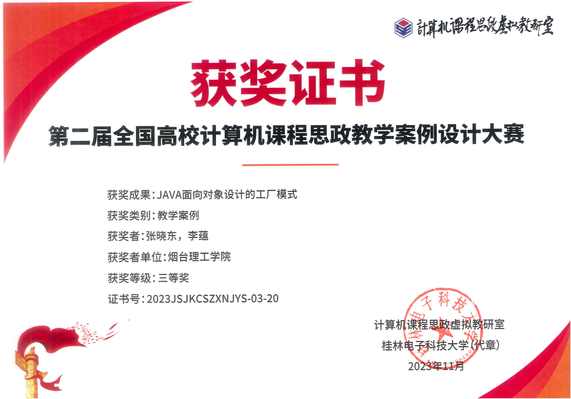近日,由教育部计算机课程思政虚拟教研室主办,成员高校承办,相关企业协办的第二届全国高校计算机课程思政教学案例设计大赛成功举办。公司ladbrokes立博宫萍团队的《流水处理技术在CPU中的应用与分析》、张晓东团队《Java面向对象设计的工厂模式》的参赛案例分别荣获二等奖和三等奖。