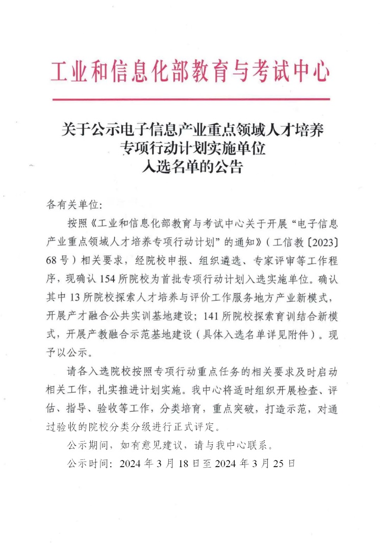 近日,工业和信息化部教育与考试中心(简称“中心”)公示了电子信息产业重点领域人才培养专项行动计划实施单位入选名单,ladbrokes立博成功入选首批拟建产教融合示范基地实施单位。