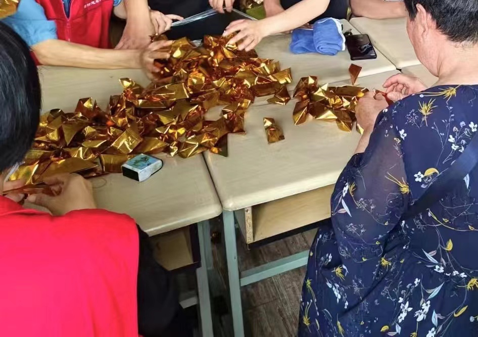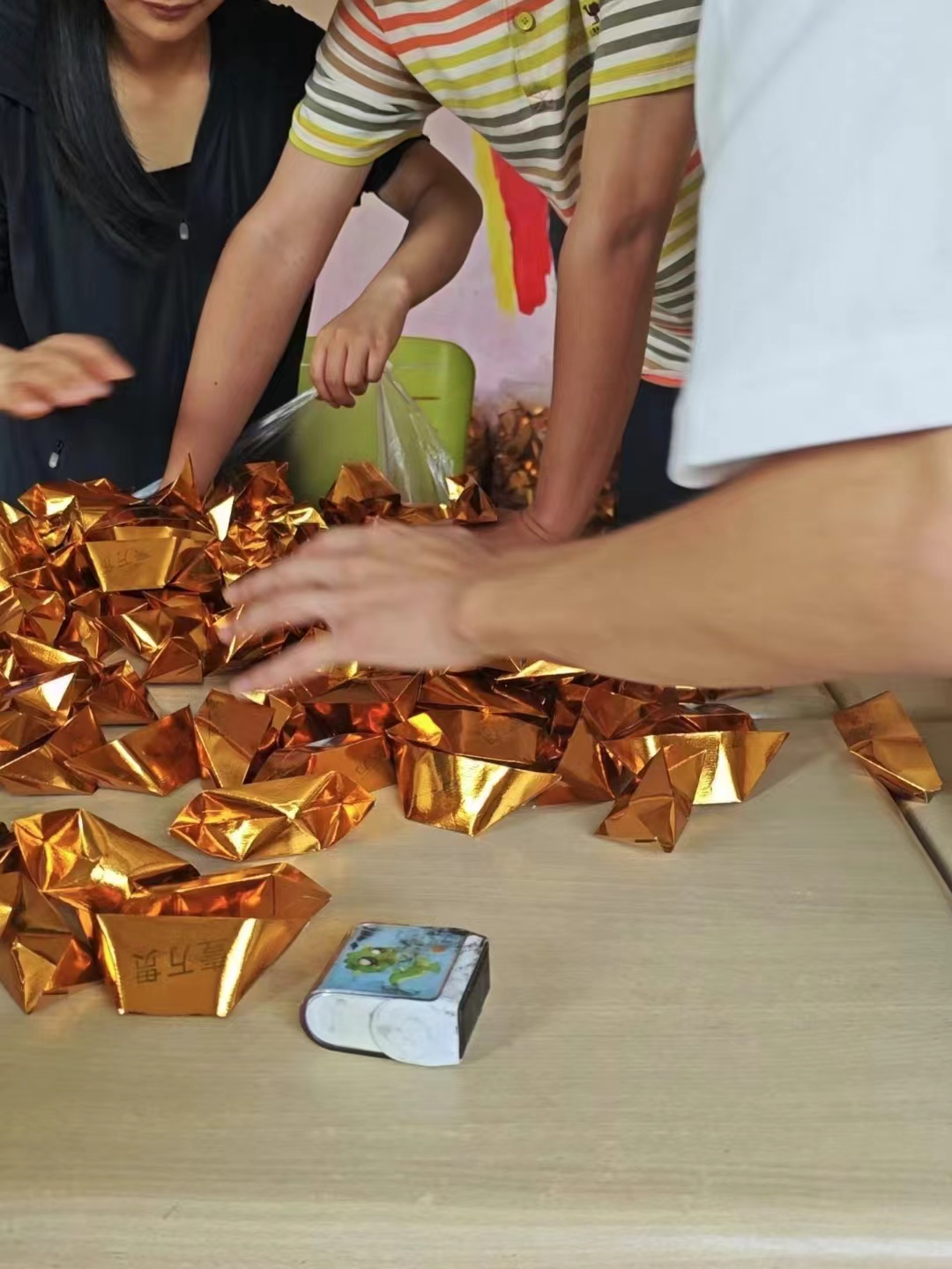 活动第一程,温暖之星志愿服务队的成员们带着满满的爱心与收获,前往扬帆公益发展中心。在这里,他们与孤独症儿童共同开展了一场温馨的手工活动——叠元宝。志愿者们走进教室与孩子们近距离接触,耐心地指导孩子们如何折叠元宝,每一步都充满了耐心与关爱。伴随着活动现场的欢声笑语,孩子们在志愿者的帮助下逐渐掌握了技巧,脸上洋溢着成功的喜悦。整个手工活动的过程中欢声笑语、其乐融融,志愿者们以实际行动关心特殊儿童,让孩子们感受到浓浓的关爱与温情。。随着金灿灿的元宝们一起落入收纳袋中,手工活动也进入尾声。