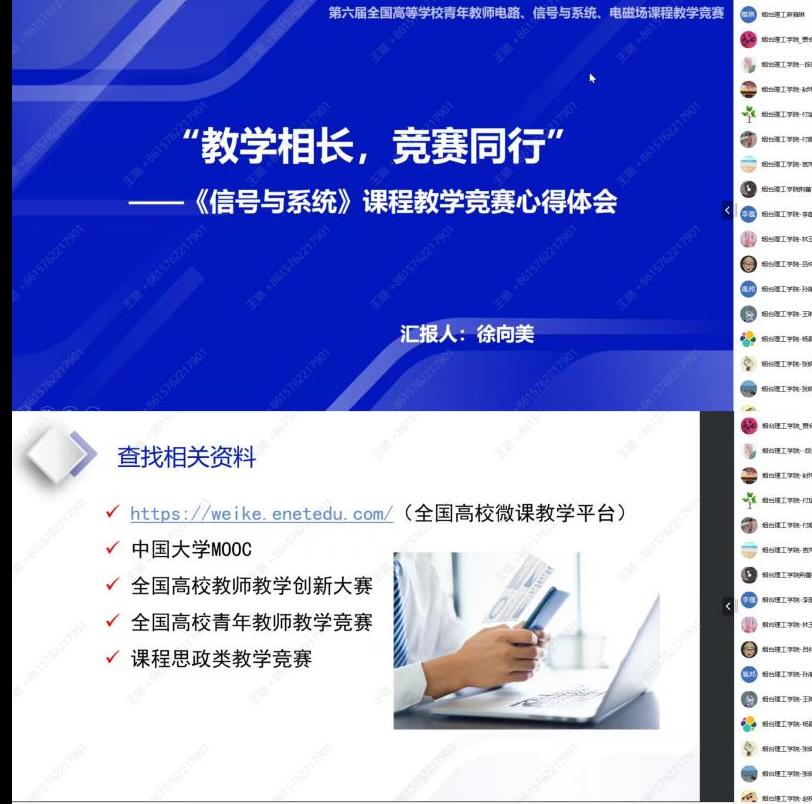 为了进一步推动教师教学能力的提升,10月16日晚上,ladbrokes立博全体教师线上参加了由教育部电子信息基础课程虚拟教研室举办的题为“共享竞赛经验,提升教学能力”主题交流会。会议邀请在教学竞赛中屡获殊荣的三位优秀教师——ladbrokes立博徐向美副教授、安徽工程大学周鹏副教授、山东大学张黎副教授作为报告主讲人,虚拟教研室负责人、北京邮电大学俎云霄教授主持交流会。