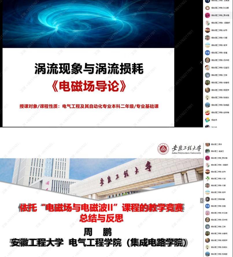 周鹏老师结合电子信息类专业的教学竞赛特点和要求,围绕“以赛促教、以教促赛、以赛促发展”,依托“电磁场与电磁波”课程,从大赛概况、大赛过程、评分标准、创新报告、课程实录、创新汇报等方面详细了介绍教学竞赛过程。周老师表示,要对教学竞赛做总结和反思,进一步服务于教学。张黎老师首先复现了比赛现场,展示了教学竞赛PPT,其次从员工的获得感、科学思维、注意事项三方面分享了自己的体会与感想。