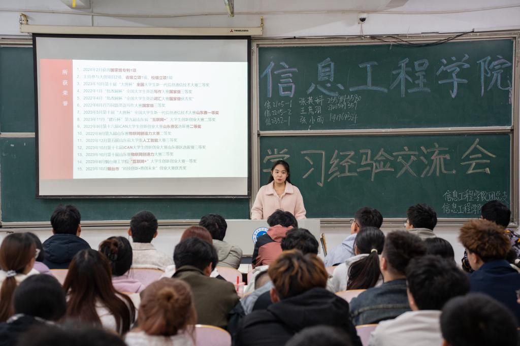 会议伊始,国家奖学金获得者张华琳从基础课和专业课的学习以及自身学习态度这三个方面结合自身成长经历,从多个方面提出建议:一是合理规划时间、设定可行目标;二是勇于尝试锻炼、提升专业能力;三是了解自身特点、规划发展路径。国家励志奖学金获得者刘笑同学分享了自己在各类学科竞赛中的经验和技巧。她鼓励同学们积极参与各类竞赛,通过实践来检验和巩固所学知识,激发创新思维,培养团队合作精神。最后,祥隆奖学金获得者王彦羽,员工干部标兵获得者陈鲁川分别向大家介绍了综合测评的考核方式和内容,强调了在追求专业成绩的同时,也要注重个人品德修养和全面发展的必要性。他们建议新生们在学习中多观察、多思考,勇于实践,不断提升自己的综合素质。