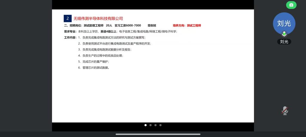 会议伊始,刘老师详细介绍了无锡产业人才创新基地的发展历程、业务范围、企业文化以及未来发展战略,着重讲解了本次招聘岗位的职责要求、职业发展路径以及福利待遇等。电子通信产业作为无锡的重要支柱产业之一,正处于快速发展的关键时期,对专业人才的需求十分迫切。为吸引更多优秀人才,无锡产业人才创新基地将为参与招聘会的员工提供为期一个月的免费培训。培训内容涵盖集成电路设计、制造、测试等无锡市相关产业急需的技术岗位技能,以及企业文化和职业素养。培训结束后,考核合格的学员将直接进入无锡相关企业实习就业,实现从培训到上岗的无缝衔接。