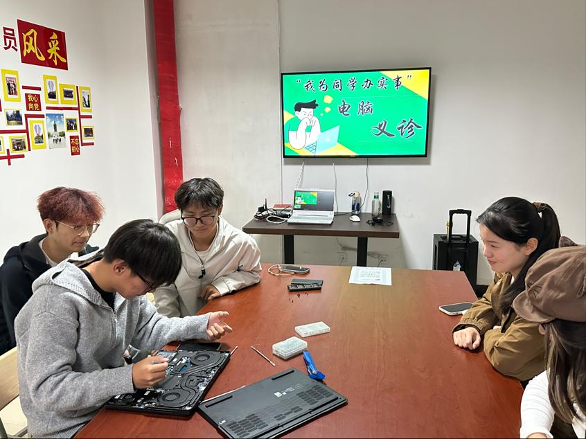 活动伊始,志愿者们提前完成工具调试、场地分区布置等工作,提供“一站式”电脑服务,涵盖拆机清灰、系统重装、软件装卸、磁盘清理、网络安全答疑、操作技巧指导等多元内容。面对不同设备“病症”,他们充分发挥专业所长: 或熟练拆解机箱、精准清理内部积灰,缓解硬件散热难题;或快速重装系统、优化参数设置,提升设备运行效率;或手把手演示文件备份、病毒查杀等实用操作,助力师生提升电脑使用能力。此外,针对有新机购置需求的同学,志愿者们还结合专业知识提供硬件配置、性价比对比等导购建议,全方位守护师生电脑使用体验。